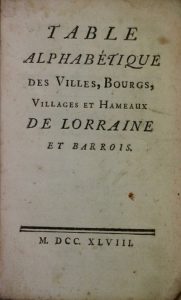 [DURIVAL (Nicolas Lutton)]. Table alphabétique des villes, bourgs, villages et hameaux de Lorraine et Barrois. [Nancy], s. n., 1748 ;
