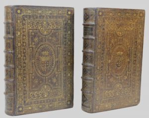 3 tomes en 2 vol. pet. in-folio, veau granité, sur les plats vaste décor d’encadrements et de motifs dorés, créant des compartiments et dégageant un médaillon central oval avec des armes dorées, dos à nerfs orné de motifs dorés, tranches jaspées, [Rel. du début du XVIIIe s., probablement allemande], petites restaurations aux mors.
