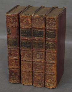 4 vol. gr. in-12, maroquin vieux rouge, encadrement d'une frise dorée sur les plats, dos à nerfs ornés de motifs dorés, pièces de titre et de tomaison vert bronze, tranches dorées, [Rel. de la fin du XVIIIe s.].