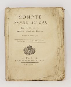 NECKER (Jacques). Compte rendu au Roi, Par M. Necker; directeur général des Finances. Au mois de janvier 1781. Imprimé par ordre de Sa Majesté. Paris, Imprimerie royale, 1781 ;