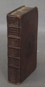 fort vol. in-12, maroquin vieux rouge, sur les plats encadarement d’une petite dentelle de motifs dorés à la roulette, armes dorées au centre, dos à nerfs orné de motifs et fleurs de lys dorés, tranches dorées sur marbrures, [Rel. de l'époque].