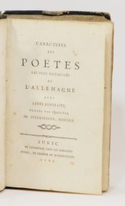 PFENNINGER (H.). Caractères des poëtes les plus distingués de l’Allemagne avec leurs portraits gravés par l’éditeur. Zurich, Fussli, Steiner de Winterthour, 1789 ;