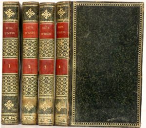 4 vol. petit in-8, veau marbré teinté de vert, sur les plats encadrement d’une chaînette dorées, dos lisse orné de petits fers dorés, pièces de titre et de tomaison rouges, tranches jaunes.