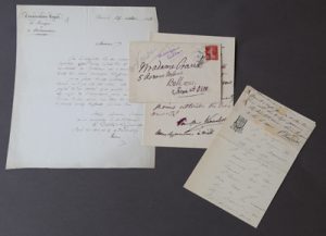 L’autre, écrite d’une main très tremblante à l’encre violette, est accompagnée de l’enveloppe avec le cachet de la Poste daté de 1909.