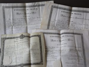 • Diplôme de bachelier ès lettres délivré à François Voulmier, le 26 août 1836, contresigné notamment par le ministre de l’Instruction publique, François Guizot et par Mathieu Orfila, Secrétaire du Conseil de l’Instruction publique.