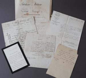On JOINT une lettre d’un officier en poste à Strasbourg, 3 mars 1808, s’adressant à son parrain, ex-avoué à Uzerche, à propos de l’aide qu’il pourrait apporter à son cousin, envoyé en garnison à Boulogne-sur-Mer, et d’une dette d’argent (3 p. in-4, adresse, marques postales).