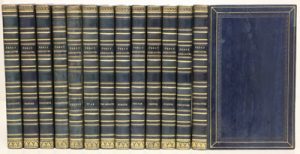 13 vol. in-12, veau bleu nuit, double encadrement doré et chaînette à froid, dos à nerfs plats orné de motifs dorés, tranches dorées, [Rel. de l'époque].