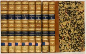 8 vol. in-12, demi-veau fauve à petits coins, dos à nerfs orné de motifs dorés, étiquettes de percaline bleu nuit, tranches jaunes, [Rel. de l'époque].