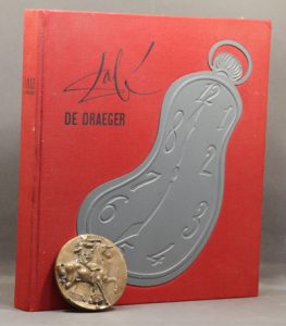 in-4 carré, cartonnage de l’éditeur toile rouge, premier plat orné d’une grande « montre molle » en métal embouti.