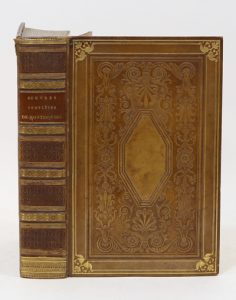 in-8, veau fauve, plats ornés d’une large plaque à froid dans un encadrement de filets dorés multiples avec fleurons dorés aux angles, dos à larges nerfs plats orné de motifs dorés et à froid, tranches dorées, [Thouvenin].