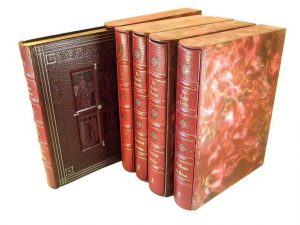 Reliure en pleine basane grenat, plats ornés à froid et dorures de motifs de chevalerie, dos à nerfs, caissons ornés et tête dorées, 5 volumes sous étuis éditeur, 27 c 20.5 cm.