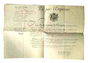 contresigné par Nicolas François, comte Mollien (1758-1850), ministre du trésor public de Napoléon et quelques autres signataires. Timbre de pension à sec peu courant avec le « N »rayonnant de Napoléon et la devise Fovent vigentes recreat que fessos.