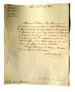 Lettre au baron Mounier pour lui confirmer que des instructions ont été données pour que soit meublé son logement au château de La Muette. Homme de confiance de Napoléon, Jacques Jean Alexandre Bernard Law, marquis de Lauriston (1768-1828) fut successivement général de division en 1805, comte de l'Empire en 1808, ambassadeur de France en Russie en 1811, marquis de Lauriston en 1817, maréchal de France en 1823 et ministre d'État en 1824.