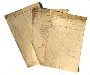Au moment de la rédaction de ces documents, Casimir-Louis- Victurnien de Rochechouart de Mortemart (1787-1875), qui s’était illustré dans les guerres napoléoniennes, fut nommé major-général de la garde nationale de Paris et maréchal-de- camp sous Charles X. Tous les manuscrits portent la signature autographe du duc de Mortemart, l’un d’eux avec le timbre à sec de l’état-major de la Garde nationale.