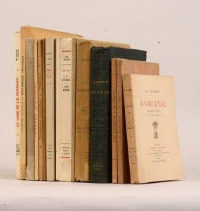 HUŸSMANS (J.-K.). L'Art moderne. Paris, Charpentier, 1883. E.O. Rousseurs. Manques à la couverture. # HUŸSMANS (J.-K.). En Rade. Paris, Tresse et Stock, 1887. In-8, percaline verte illustrée Le Livre-échange. E.O. Suivit d'un Répertoire du voyageur, annuaire d'hôtels et cafés en France, Algérie et étranger. # HUŸSMANS (J.-K.). A vau-l'eau. Paris, Tresse et Stock, 1894. Deuxième édition, ornée d'un portrait de l'auteur par A. Delâtre. # BRICAUD (Joanny). Huysmans. Occultiste et magicien. Paris, Chacornac, 1913. Couverture détachée. # DEFFOUX (Léon) et Émile ZAVIE. J.-K. Huysmans. Converti littéraire. Paris, Écrits français, 1914. Envoi autographe signé des auteurs. # VALÉRY (Paul). Huysmans. Paris, s.n., 1927. Édition illustrée d'un portrait par Charles Joas. Un des 100 exemplaires sur vélin blanc de Rives. # MUGNIER (Abbé). J.-K. Huysmans à la trappe. Paris, Le Divan, 1927. E.O. [2 exemplaires dont un avec envoi autographe signé]. # [COLLECTIF]. Le Divan. Le Souvenir de J.-K. Huysmans. Mai 1927. # GROLLEAU (Charles) et Georges GARNIER. Un logis de J.-K. Huysmans. Les prémontrés de la croix-rouge. Paris, Crès, 1928. # LANGÉ (Gabriel-Ursin). Itinéraires huysmansiens. Fécamp, La Feuille en 4 , 1933. Un des 65 exemplaires sur vergé bouffant. # GARÇON (Maurice). Huysmans inconnu. Paris, Michel, 1941. In-8, broché. Un des 10 exemplaires sur Rives. # BILLY (André). J.-K. Huysmans et ses amis lyonnais. Lyon, Lardanchet, 1942. Édition illustrée par Pierre Falké. Un des 500 exemplaires sur vélin Lafuma-Navarre. # MEURGEY DE TUPIGNY. Le Sentiment héraldique dans l'œuvre de J.-K. Huysmans. Paris, s.n., 1946. Un des 200 exemplaires sur Rives. # DESCAVES (Lucien). Deux amis. J.-K. Huysmans et l'abbé Mugnier. Paris, Plon, 1946. # BOUCHER (Gustave). Une Séance de spiritisme chez J.-K. Huysmans. Paris, Ficker, s.d.