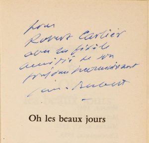 Édition originale. # Envoi autographe signé : Pour Robert Carlier, avec sa fidèle amitié, de son toujours reconnaissant, Samuel Beckett. # Robert Carlier, éditeur et grand ami de Beckett a contribué à faire publier son œuvre aux éditions de Minuit.