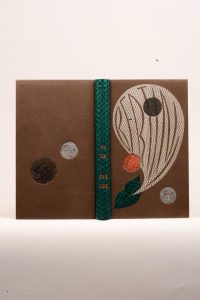 BERTINI (Gianni). Pour parler (et pour cause). S.l., Éd. du Castel Rose, 1962. In-8, box grainé havane, plats rapportés, composition mosaïquée en peaux de cobra et de lézard représentant une bouche d'où s'échappe un phylactère contenant le...