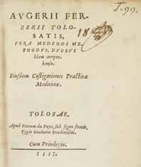 FERRIER Auger - Vera medendi methodus, duobus libris comprehensa. Toulouse, Pierre du Puys, 1557. 8 ff. n. c. titre compris, 432 pp. c. et 6 ff. en un vol. in-8 rel. ép. plein veau brun, dos à cinq nerfs. Exemplaire exceptionnellement grand de marges de cette édition peu commune du célèbre médecin Toulousain qui vécut de 1513 à 1588 et fut le médecin attitré de la reine Catherine de Médicis. Imprimée par G. Boudeville (indication portée au verso du dernier feuillet), elle est dédiée au Cardinal Jean Bertrand, toulousain qui fut une des personnalités majeures du monde juridique et diplomatique du XVI e siècle (charnières fendues, manques de cuir aux coiffes et petits manques angulaires de papier à deux feuillets sans atteinte du texte). Édition originale peu commune de ce traité réédité plus tard à Lyon et à Venise.