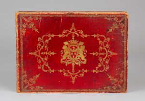 In-8° oblong, maroquin rouge, fine roulette dentelée dorée encadrant des plats ornés d’un décor à motif « rocaille », armoiries au centre, dos à nerfs orné, tranches dorées et ciselées (reliure de l’époque).