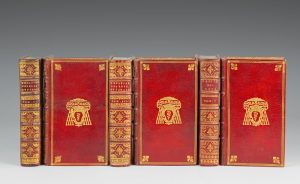 6 volumes in-12 (100 x 167 mm), maroquin rouge, triple filet doré encadrant les plats, fleuron aux angles (ou fleur de lys pour les 3 derniers volumes), armoiries au centre, dos à nerfs orné, tranches dorées (reliure de l’époque).