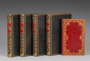 In-8°, maroquin rouge, fine roulette dentelée dorée encadrant les plats, armoiries au centre, dos à nerfs orné des mêmes armes, tranches dorées (reliure de l’époque).