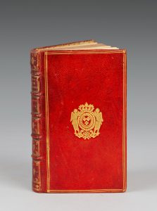 12 volumes in-12 (92 x 161 mm), maroquin rouge, triple filet doré encadrant les plats, monogramme couronné aux angles, dos à nerfs orné du même motif, tranches dorées (reliure de l’époque).