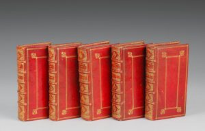 5 volumes petit in-12 (72 x 140 mm), maroquin rouge, double encadrement de filets dorés à la Duseuil ornant les plats, dos à nerfs orné, tranches dorées (reliure de l’époque).