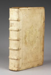 3 tomes en un volume in-folio, vélin ivoire, double encadrement de filets estampés à froid ornant les plats, large fleuron central, traces de lacs, dos à nerfs (reliure de l’époque).