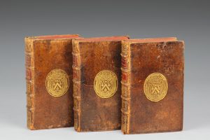 3 volumes in-12, veau, armoiries dorées au centre des plats, dos à nerfs orné (reliure de l’époque).