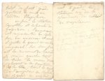Intéressant document sur son projet de statue équestre pour le monument de Napoléon à Ajaccio. {CR}Vers 1860-1862, la ville d’Ajaccio projette d’élever, par souscription publique, un monument à la gloire de Napoléon. L’architecte Viollet-le-Duc sera chargé de concevoir ce monument, et Barye de la statue de l’Empereur.{CR}Barye a noté ici sa première vision du monument, assez différente du résultat final, hormis la statue équestre monumentale de l’Empereur. Barye imagine « une large base entourée de colonnes et de bas-reliefs supportant aux quatre coins quatre statues », allégories de l’Empire tenant le globe, le sceptre, la main de justice et la couronne impériale. [Dans la version finale, ces figures seront remplacées par les quatre frères de Napoléon, sculptés par Aimé Millet, Thomas, J.-C. Petit, et Maillet]. Une autre base moins large et moins haute sera « décorée de bas reliefs et portant aux quatre angles quatre Aigles ayant les ailes déployées [ceci sera supprimé]. Un piédestal décoré encore de bas-reliefs et haut de huit pieds portant ce mot au centre Napoléon. Enfin, la statue équestre et colossale de Napoléon : l’empereur est représenté en selle sur un énorme cheval, il porte le grand manteau impérial ; sur son front est la couronne de lauriers, sa main gauche tient la bride, la main droite s’élevant à la hauteur de la tête, tient le sceptre de l’empire. La statue a 15 pieds »... Ces notes comprennent aussi 2 pages de mesures indiquant les dimensions voulues par le sculpteur des différentes parties de l’œuvre, et quelques croquis hâtifs, ainsi que quelques calculs...