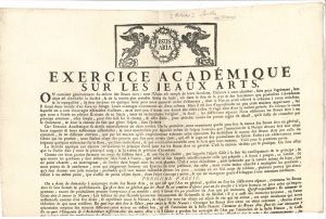 BEAUX-ARTS. Affiche, Exercice académique sur les beaux arts, 1764 ; environ 48,5 x 37 cm, vignette gravée sur bois.