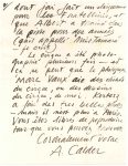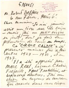 Belle lettre sur son cirque.{CR}« Je n’ai jamais écrit un livre sur le Cirque – mais j’ai un petit cirque en jouets, dont je fais la présentation de temps en temps. Ce Cirque Calder a été présenté maintes fois à Paris entre 1927-1933, et en 1937. Il a été apprécié par Marc Real, Legrand-Chabrier, Frejaville, Paul Fratellini, et beaucoup d’autres. J’ai un chien en tuyeaux de caoutchouc qui marche dans mon cirque dont j’ai fait un élargissement pour les Fratellinis, et que Albert a traîné dans la piste pour des années (qu’il appellé “Miss Tamara” - je crois). Le cirque a été photographié plusieurs fois – et ça se peut que le photographe Marc Vaux aie des clichés du cirque, ou des dessins du cirque, de moi. Kertész a fait des très belles photos – mais il n’est plus à Paris. Vous êtes libres de reproduire tout ce que vous pouvez trouver »... [Delpire éditera, en collaboration avec Pierre Faucheux et avec la participation d’artistes et écrivains, Permanence du Cirque, dans la revue Neuf, Paris, 1952].