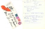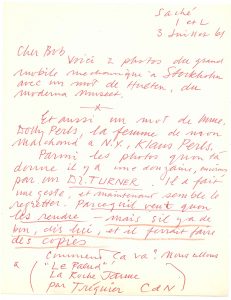 Intéressante correspondance avec l’éditeur au sujet d’un projet de livre sur Calder. 6 lettres sont signées « Sandy », 2 « Sandy Calder », et une carte « Calder » {CR}Saché 13 juin 1961. « J’allais attendre que Jean [Davidson, son beau-fils, reporter] t’aurait écrit – parce que j’avais les mêmes sensations que lui, et je voulais essayer d’éviter une répétition. J’aime beaucoup moins les livres sur Klee et Kandinsky – que les livres sur l’Afrique, sur les Ballons, et même sur les Bêtes étranges (Arts fantastiques). Comme tu as fait le tout ça ne doit pas te gêner qu’on aime mieux une chose qu’une autre. Les photos sont formidables – en profondeur et en matière. Pourquoi aurons-nous besoin d’un autre photographe que toi ? » Il l’invite à venir quand il veut faire des photographies et lui propose de l’héberger. « Pour le bouquin, j’aime beaucoup l’idée de Jean de rassembler quelques noirs, qq. blancs, qq. rouges »... Saché 3 juillet. Il lui envoie deux photos du « grand mobile mechanique à Stockholm », avec un mot de Pontus Hulten du Moderna Museet. Son marchand de New-York, Klaus Perls, l’informe du désir de son photographe Turner de récupérer les photos transmises à Delpire. Il part pour le Palud à la Roche Jaune en Bretagne... [Tréguier 17 août, au dos d’une carte représentant une fresque de la Chapelle de Saint-Gonery de Plougrescant] : « Nous pensons rentrer à Saché le 21 ou 22 »... Saché 31 août. Les Calder partiront pour New-York le 12 octobre : « Si possible j’aimerais beaucoup vous voir ici avant notre départ. [...] As-tu parlé avec L. Carré concernant la préface de Sartre ? » Saché 1er octobre. Organisation d’une séance photo avant son départ pour le Havre le 11 octobre : « Il serait bien d’envoyer M. Martin mais au moins plusieurs jours avant notre départ. [...] Il peut demeurer chez nous quelques nuits – avec plaisir ! Demandez-lui d’apporter du blanc et noir et aussi couleurs (pellicule) »... Roxbury 4 novembre. Il espère que son travail avance bien avec les photos qu’il a faites et celles prises par André Martin. « J’ai 2 ou 3 à ajouter chez moi. Et Melle Seiberling, de Life, m’a offert un tas […] de Gordon Parks, et d’autres très bonnes. Mais je ne l’ai pas fouillé encore, en attendant vos ordres. Si tu fais une maquette, montre-la à Jean, qui pourrait, dans qq. mots, décrire le contenu »... Roxbury 18 décembre [il vient d’apprendre que l’éditeur Dumont-Shauberg ne publierait le livre en Allemagne qu’en 1963] : « Tant pis ! Quand il n’y a pas d’espoir, pourquoi être pressé ? {CR}J’irai chez Life un jour choisir qq. photos en couleurs »... Que Delpire l’appelle en arrivant à New York : « J’espère que tu passeras 1 jour, ou 2, à Roxbury »... L’enveloppe est ornée du dessin à l’encre de Chine d’une flèche colorée à l’aquarelle rouge. 21 janvier [1962]. Il prie Delpire de choisir lui-même les photos à Life quand il sera à New York... « Je trouve l’ambiance du film du cirque formidable, et lui et elle sont charmants »... [Le Cirque de Calder, film de Carlos Vilardebó, 1961]. [Saché 12 mai 1962, au dos d’une carte représentant une de ses peintures] : « Nous sommes à Saché de nouveau. As-tu une maquette du grand œuvre ? Pour nous montrer ?? »...{CR}Liste autographe d’une quarantaine d’œuvres. Au sylo bille rouge liste marquée en tête « Delpire » d’une vingtaine d’œuvres, certaines avec leur localisation : « Gouache de 32-33. Circus drawings. Wire – reclining nude – N. Dean Boston. Oqunquit – Sert (colours). Orange Panel – Lloyd », etc. ; puis, au stylo bleu, des « objets à Paris », classés par collectionneurs (K. Dudley, Zervos, Cuttoli…) : « K. Dudley – White discs – Black sticks. […] Cuttoli – Black dining room –Suspension – gouache (color) – table mobile »… et il fait un croquis du mobile chez Painlevé...{CR}