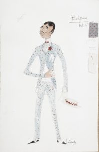Maquettes de costumes pour La Main passe de Georges Feydeau, comédie en 4 actes, mise en scène par Pierre Mondy au Théâtre Marigny en septembre 1971 (filmée le 22 janvier 1972 pour Au théâtre ce soir). Catulle a dessiné chaque personnage en pied, vêtu de ses différents costumes selon les actes de la pièce, avec les échantillons des tissus choisis épinglés à chaque page. Costumes de Massenay (Jean-Pierre Darras, 2), Chanal (Alfred Adam, 2), Francine Chanal (Sophie Desmarets, 2), Panteloup (Marc Dudicourt), Coustouillu (Georges Montillier, 3), Belgence (Philippe Dumat, 2), Auguste (Daniel Prévost), Madeleine (Anne Roudier), un commissaire (Aimé-Jean).