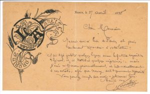 Émile Goutière-Vernolle (1855-1927) journaliste, critique d’art, membre fondateur de l’École de Nancy. L.A.S., Nancy 27 avril 1888 ; 1 page obl. in-8, vignette gravée de La Lorraine Artiste.