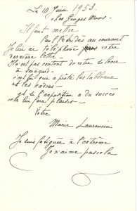Marie LAURENCIN (1883-1956). L.A.S., 10 juin 1953, à Georges Moos ; 1 page in-8.