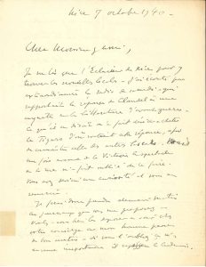 « Je ne lis que L’Éclaireur de Nice pour y trouver les nouvelles locales. J’ai écouté par extraordinaire la radio de samedi – qui rapportait la réponse de Claudel à une enquête sur la littérature d’avant-guerre – ce qu’il en disait m’a fait désirer acheter le Figaro d’où sortait cette réponse, afin de connaître celle des autres lascars »... Avenue de la Victoire, cependant, le spectacle de la rue lui a fait oublier cette course, mais il fera prendre demain les journaux... « Votre sujet de conférence est très intéressant pour le moment où les artistes sont assez négligés et plutôt dépréciés. J’ai reçu une carte de Paris qui dans son laconisme me fait prévoir un délaissement et un débinage que j’ai déjà connu et qui après tout m’a bien réussi. La bastonnade est souvent meilleure que l’adulation pour ceux qui ont un certain cran et le sourire après l’humiliation (H. de M.). Ne désirez-vous pas que nous nous rencontrions ces jours-ci pour en parler un peu ? Si oui, je vous inviterai à la Coquille. Le déjeuner est favorable à la causerie qui lui fait suite, par l’atmosphère familière qu’il crée et l’excitation d’esprit qui lui fait suite »... Il évoque une interview par un Américain qui est venu le voir à Nice : « j’y soupçonne beaucoup d’idioties ou tout au moins de choses à côté. Je n’ai pas eu l’occasion de le faire traduire »...