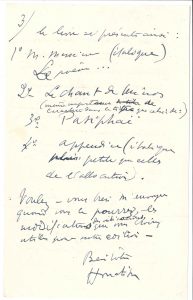 Sur la préparation de leur livre illustré Pasiphaé, Chant de Minos.{CR}Sa fille va pour quelques jours à Paris, et voudrait voir La Reine morte : « pouvez-vous quelque chose pour qu’elle ait un tour de faveur ? Je cohabite avec Pasiphaé et si nous arrivons à un accord entre vous l’éditeur et moi, je ne crois pas que la réalisation du “Livre” puisse tarder. Je précise ce que je vous ai demandé déjà plus ou moins vaguement : voulez-vous m’indiquer d’une façon précise la présentation de Minos – je crois : en tête du livre après votre conférence d’introduction – comme un premier acte. Pasiphaé ensuite, sans autre indication de préséance que l’absence de Minos sur le titre du livre. Le livre se présente ainsi : 1° M. Messieurs (italique) Le poème... 2° Le Chant de Minos (même importance de caractère dans le titre que celui de :) 3° Pasiphaé 4° appendice (italiques plus petites que celles de l’allocution). Voulez-vous bien m’envoyer quand vous le pourrez, les modifications des indications que vous croirez utiles pour notre édition »... Il ajoute trois notes (biffées ensuite par Montherlant) concernant l’édition Grasset de 1938, le copyright de Grasset, le justificatif de tirage et la première représentation (date, distribution)...