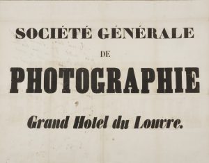 Très rare affiche sur les débuts de Nadar photographe, annonçant simplement : « Société générale de PHOTOGRAPHIE {CR} Grand Hôtel du Louvre ».{CR}Ce projet de Nadar, qui s’inscrit dans le sillage de la Société héliographique (1851-1853) et de la Société française de photographie (fondée le 15 novembre 1854), semble avoir été formé à l’automne 1855. Nadar, qui était alors en procès avec son frère Adrien, voulait installer cette « Société générale de photographie » sur le toit du Grand Hôtel du Louvre, rue de Rivoli, et reçut le soutien du baron Taylor, de Gavarni, Dauzats, Delacroix, Diaz, Nanteuil, Troyon, du marquis de Chennevières, etc. Mais le projet n’aboutit pas [voir le catalogue Nadar. Les années créatrices : 1854-1960, Musée d’Orsay, 1994, p. 304], et cette affiche en est un des rares témoignages.{CR}Au dos, d’une grande écriture, Nadar a écrit : « Merci bien, mon joli petit Ga, d’avoir pensé à moi. Je vous en sais bien bon gré, mais il m’était impossible de vous aimer davantage. Je n’ai plus besoin. – Merci et bien à vous de tout mon cœur, Votre Nadar-chon ».