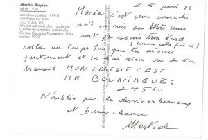 Martial RAYSSE (né en 1936). L.A.S. « Martial », 25 juin 1996, à une amie peintre Marie H. ; 1 page oblong in-12 au dos d’une carte postale représentant son tableau Les Deux Poètes, enveloppe.{CR}On joint un carton d’invitation avec...