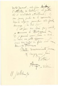 À propos de sa série consacrée aux provinces, La Vieille France. Il le remercie d’avance pour « la Nature, ce sera un puissant coup d’épaule. Je m’autorise de ce que vous avez toujours été si aimable avec moi pour abuser. Ne pourriez-vous prendre un ou deux clichés du volume pour votre journal, cela fixe mieux l’attention du lecteur. Le public est si récalcitrant actuellement ! Si vous pouviez parler de la Normandie dans le corps du journal cela ferait beaucoup j’en suis sûr. C’est pour ma série que j’insiste, je commence la Bretagne & si je pouvais avoir, sinon un succès, du moins une petite apparence, je serais bien content de faire ainsi mon tour de France »...