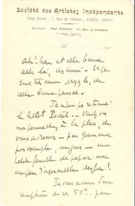 Paul SIGNAC (1863-1935). L.A.S., Paris [12 février 1911], à son ami Victor JOZE ; 1 page et demie in-8 à en-tête Société des Artistes Indépendants, enveloppe.