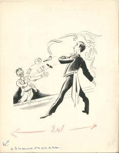 Ralph SOUPAULT (1904-1962) dessinateur de presse, condamné à 15 ans de travaux forcés pour sa collaboration à Je Suis Partout. Dessin original signé à l’encre de Chine ; 18 x 18 cm sur feuille 25,5 x 33 cm.