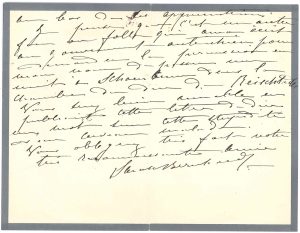 Elle transmet à Calmette une lettre dont l’auteur « dépasse les bornes », en le priat de la publier. « Je pense que c’est un autre fou ou folle qui aura écrit au gouvernement autrichien pour demander la permission en mon nom de passer une nuit à Schoenbrunn dans la chambre du duc de Reischtadt. Vous serez bien aimable en publiant cette lettre de dire un mot sur cette stupidité d’un cerveau malade »...