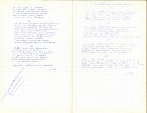 Ensemble de paroles de chansons interprétées par Édith Piaf ou qui lui ont été proposées. La plupart sont dactylographiées ou ronéotées ; certaines sont annotées (indications techniques pour les éclairages lors des concerts, rectifications, cachet de censure...). D’autres sont accompagnées de lettres ou mots d’envoi (René Rouzaud, Jacques Bréhal, J. Ozanne, Roger Normand…). Cahier autographes de 80 « Chansons en paroles » par S.K. Classeur gris de paroles de chansons dactylographiées.