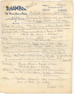 Tours de chants. Dossiers techniques pour les éclairages des représentations d’Édith Piaf, certaines avec les Compagnons de la Chanson : au Moulin Rouge de Genève et à la Gaieté Lyrique en février 1946, au Théâtre National de Chaillot en mai 1946, à L’Étoile à l’automne 1947, aux Ambassadeurs en mars 1948, à la salle Pleyel en juillet 1948, à l’A.B.C. au printemps 1949, au Club des Cinq, à Bobino, à l’Alhambra...