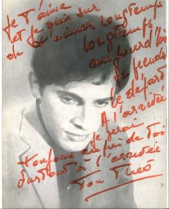 Programme dédicacé (concert d’Édith Piaf organisé par Jean Donda, avec Théo Sarapo en première partie, 1962), illustré par les portraits noir et blanc des artistes, annoté par Piaf en couverture (extrait de sa chanson A quoi ça sert l’amour) : « C’est toi que je voulais, c’est toi qu’il me fallait. Toi que j’aimerai toujours. Ça sert à ça l’amour »... ; et par Théo Sarapo en dernière page, qui répond : « Je t’aime et je suis sûr de t’aimer longtemps longtemps aujourd’hui je prends le départ. À l’arrivée je serai toujours auprès de toi. Surtout à l’arrivée. Ton Théo ». {CR}Affichette pour le concert de Piaf au Casino de La Baule (1952). 2 programmes de récital à l’Olympia (février 1958 et décembre 1961). Concert donné par Piaf à l’Ancienne Belgique (20 novembre 1962), avec Théo Sarapo en première partie. Concert de Théo Sarapo à l’Alcazar de Marseille. Plaquette promotionnelle Polydor pour les disques de Piaf.