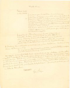 Lettre-poème à Jean Cocteau.{CR}« Bonne année. Le Rhin déborde.{CR}Je me promène parmi les inondations, l’univers à mon image.{CR}Parfois l’eau est trop verte ou trop violette, et le pont de bateaux de Drusenheim emporté par le fleuve jaune a passé devant le poste de grand’garde. Mon ami le lieutenant qui connaît toutes les colonies et qui a fait couper la tête d’un chef de village quand il était commissaire de police à Lang-son, a ordonné qu’on présente les armes aux pontons emportés à la dérive en souvenir de Rimbaud.{CR}Têtes des osiers sortant seules des forêts inondées : vieilles fantasmagories, gnomes vous ne me faîtes pas peur, je ne redoute plus que les machines-à-écrire-mystères.{CR}Les yeux bleus de l’Allemand qui m’a joué la mort de Boris Godounov [...]. à Strasbourg chez un petit papetier qui vend les journaux, je trouve tout Gobineau. Cherchons, si nous y trouvions Lautréamont ou Jarry.{CR}Pour que j’y puisse aller à la messe de minuit, Vauban a construit à Fort-Louis une église à ma taille. Dire tout haut dans la nef : la majesté de ces lieux.{CR}Vous voyez bien qu’on se fait à toutes les vies. Mais je m’attends aux pires catastrophes. Les lettres de Paris m’apportent l’écho affaibli des chants magiques. Je ne suis guère ce tourbillon. Qu’écrivent donc les gens je ne sais plus rien. André B. [Breton] vous a-t-il montré son Monsieur V. [poème de Mont de piété]. Le plus émouvant poème. Mais aussitôt qu’il l’eut écrit, incompréhensible galvanisation. C’est depuis ce billet qu’il m’a écrit que je suis en grand deuil de mon ami André. Désormais je reste seul sur la terre. Si par hasard André n’était que disparu. Comme j’ignore la vie et la ville, quand paraîtra le Cap [de Bonne-Espérance] tant espéré ? Je ne vous parle pas de vous, ceci est une lettre de Bonne Année »...