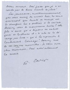 21 janvier 1950. Il espère que la santé de son correspondant s’est améliorée. Il était lui-même « passablement déprimé. Toujours la même fatigue générale. Mais j’ai fini par signer deux contrats pour des films tirés de la vie de Verlaine et de Morsure et me voici bien forcé de me mettre au travail. […] Dieu fasse que je n’accouche pas de deux navets de plus ! »… 22 juillet. Il lui écrit à la hâte, étant à la veille de partir en vacances. « Ce qui m’ennuie surtout est de ne plus pouvoir vous faire tenir chaque semaine les quelques journaux que je mettais de côté pour vous. Toutefois, si votre fils pouvait passer les prendre, le samedi, chez la concierge, je donnerai des ordres pour qu’elle les lui remette directement »...