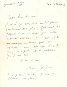 Jean COCTEAU. L.A.S., Paris 18 mars 1945, à un ami ; 1 page in-4.
